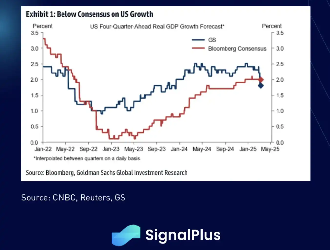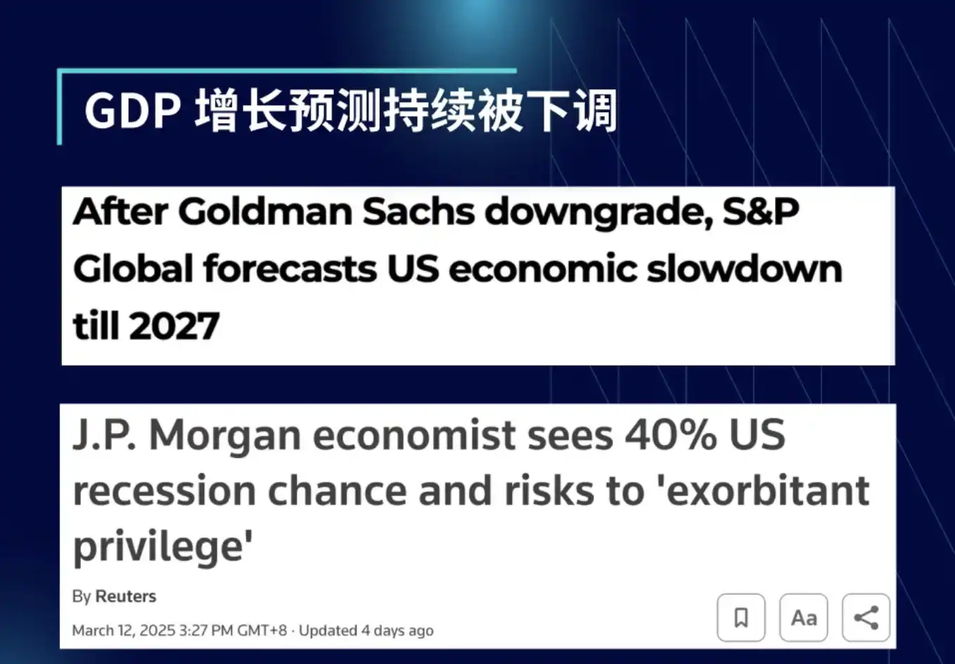 尽管市场仍在努力站稳脚跟,不过华尔街的经济学家已经提前做出反应,高盛成为首家大幅下调美国 2025 年 GDP 增长预测的主要投行,将增长预期从 2.4% 砍至 1.7%,并指出由于关税影响增加,「下调的主要原因是对贸易政策的假设变得更加不利」。与此同时,摩根大通将美国经济衰退的可能性上调至 40%,并指出其依赖低融资利率、高资本流动和有吸引力的美元资产来支撑不断上升的财政赤字的「过度特权(exorbitant privilege)」正面临风险。
