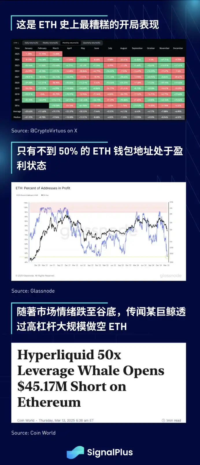 市场情绪冷淡、盈亏止损压力、缺乏新的叙事驱动力、Layer 2 价值分配问题尚待解决等因素持续拖累 ETH 的表现。根据 CoinGecko 数据,稳定币的总市值($ 2, 360 亿)已经超过 ETH($ 2, 260 亿),所有 ERC 20 代币的总市值($ 2, 550 亿)也同样如此。不仅如此,这也是 ETH 历史上首次在新年开局的前三个月出现负报酬,年初至今价格已跌 近 48%,只有不到 50% 的活跃钱包地址处于盈利状态,亏损面广泛蔓延。