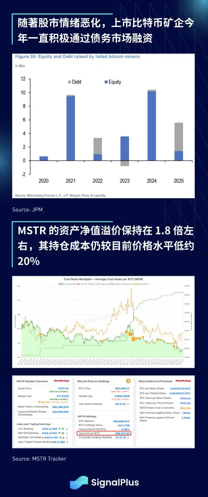 由于市场情绪受到影响,上市比特币矿企已开始转向债务市场来满足其资本支出融资需求。目前,只要融资渠道保持开放,矿企应能维持运营而无需大规模抛售 BTC,从而控制市场卖压,然而,这一领域仍值得密切关注。目前,MSTR 的资产净值溢价保持在 1.8 倍左右,而加权平均 BTC 持仓成本约为 $ 67 K,较当前市场价格仍有 15–20% 的价格缓冲空间。