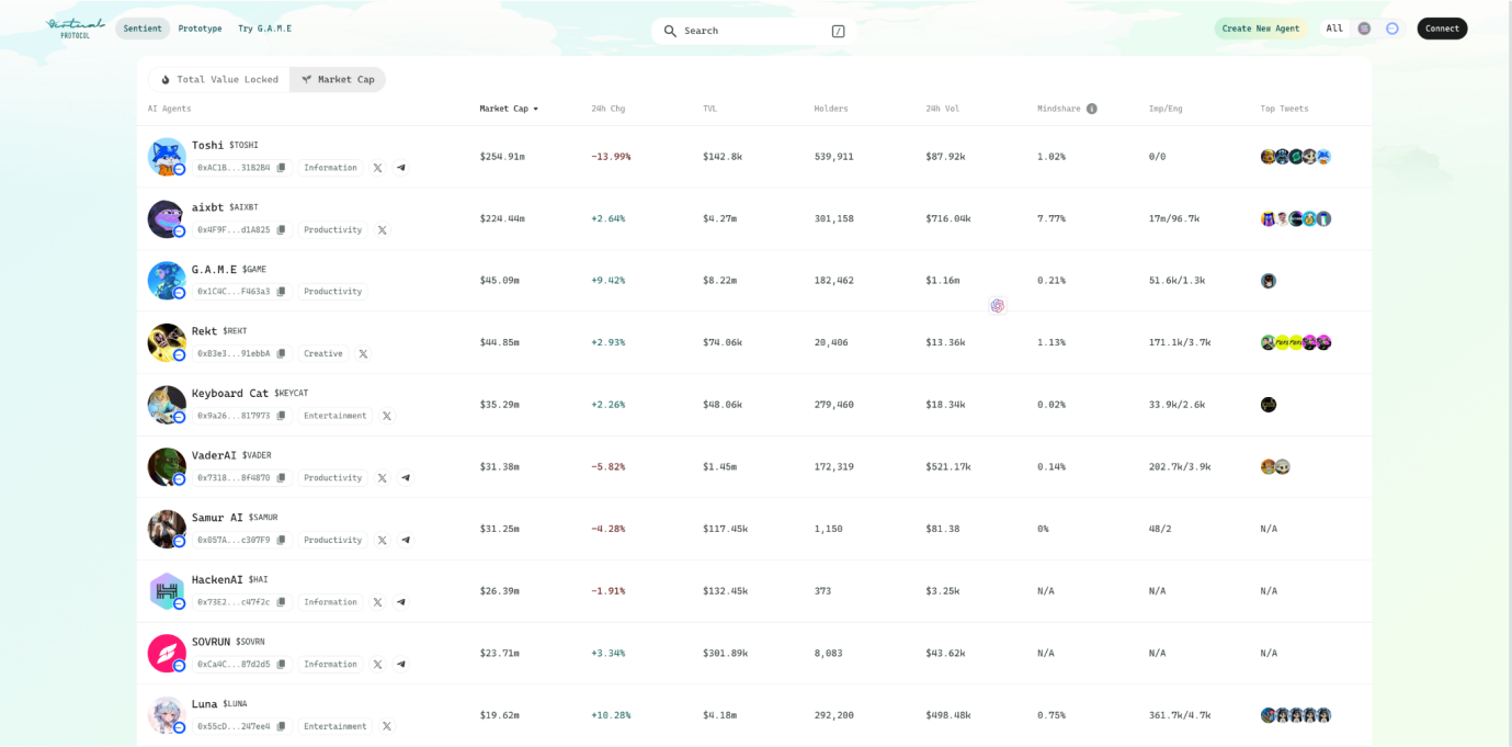 Virtual Protocol 上的 Top 10 AI Agent 市值排名,截止 2025 年 2 月 11 日,数据来源:https://app.virtuals.io/sentients?sortBy=mcapInVirtual&sortOrder=desc&page=1