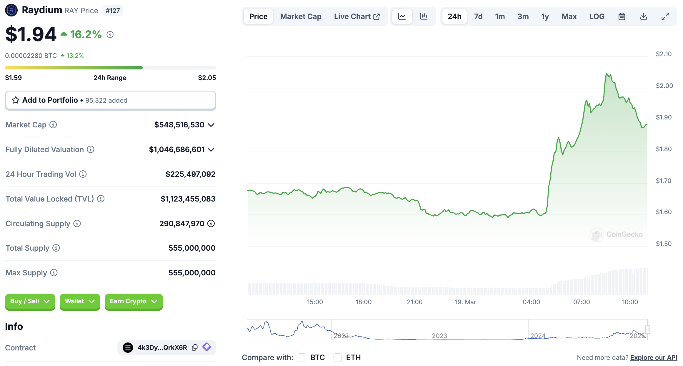 消息一出,基本相当于变相结束了 Pump.fun 与 Raydium 之间非正式的合作关系。据悉,LaunchLab 将提供线性、指数和对数结合曲线,以匹配代币的需求和价格。它还将允许第三方用户界面设定自己的费用。市场对这则消息反应迅速,截至撰稿,RAY24 小时内上涨 16.2%,短时触及 2.05 美元。