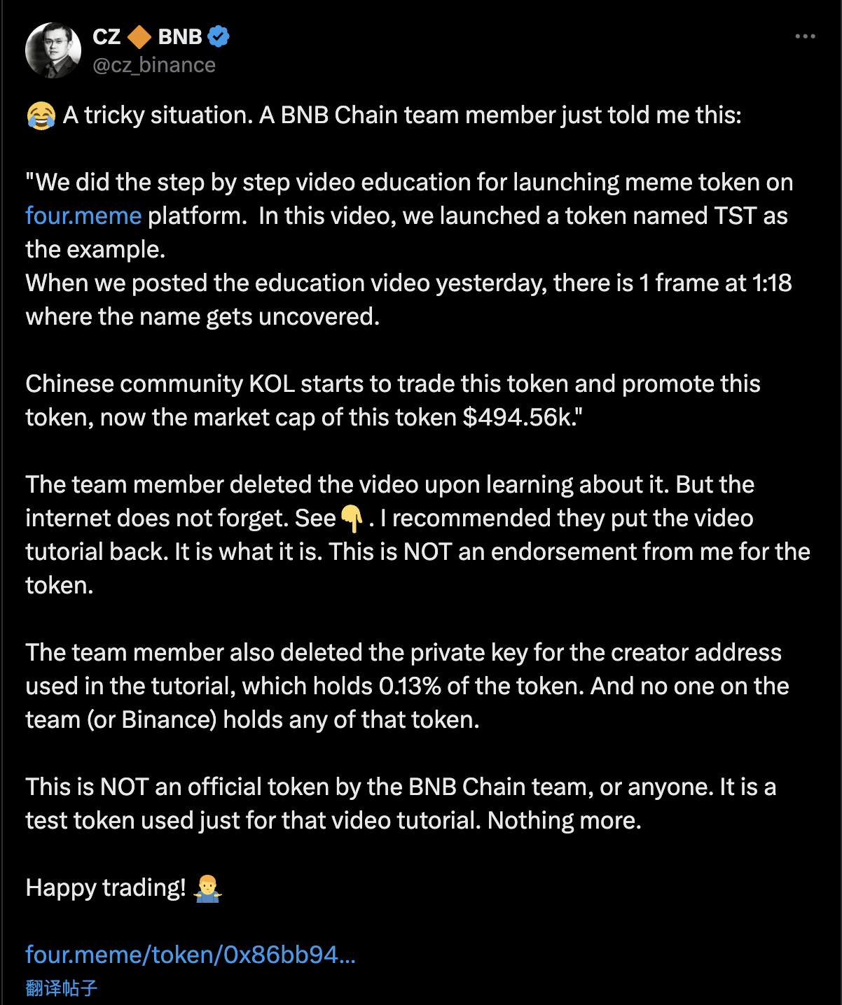 BSC 的 Meme 技巧增长可以分为三部分,2 月 5 号,BNB chain 团队发布了一个 Four.meme 的宣传视频包含了测试代币,类似的测试代币被市场炒作其实并不罕见,包括之前的 pumpfun 或各类 Dex 的演示视频。奇特的是从来不玩 Meme 的 CZ 对此的态度。第二天 CZ 转发该条视频推文并说明了情况,而他的解决方案总结来就是一句话「Happy Trading」。