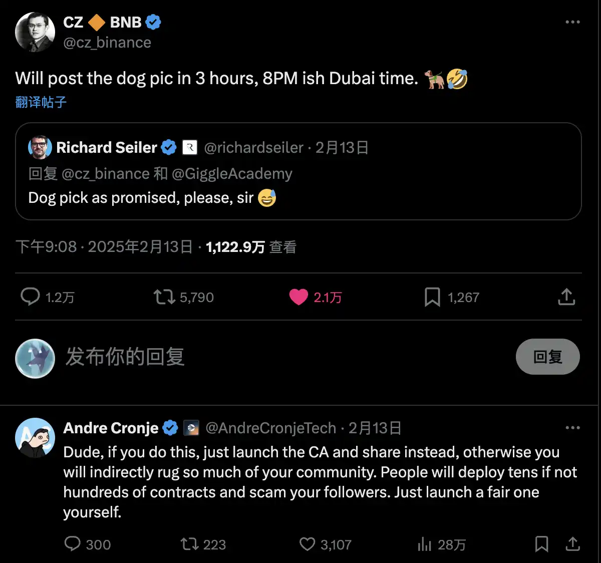 当有人建议使用随机狗狗照片时,CZ 回应称,不,那将是欺骗。如果要做,就要做得正确。这只是分享一张狗狗照片和名字而已。