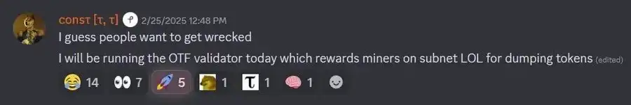 实际发生的情况是:投机者买入 SN28 代币 → SN28 价格上涨,SN28 价格上涨 → 获得更多 TAO 释放量,如果 TAO 释放量超过子网的代币释放上限 → SN28 价格继续上涨,释放的 SN28 代币按照持有比例分给「矿工」→ 持有 SN28 越多,分到的越多,为了获得更多 TAO,更多人买入 SN28 → 价格更高 → 庞氏循环继续。