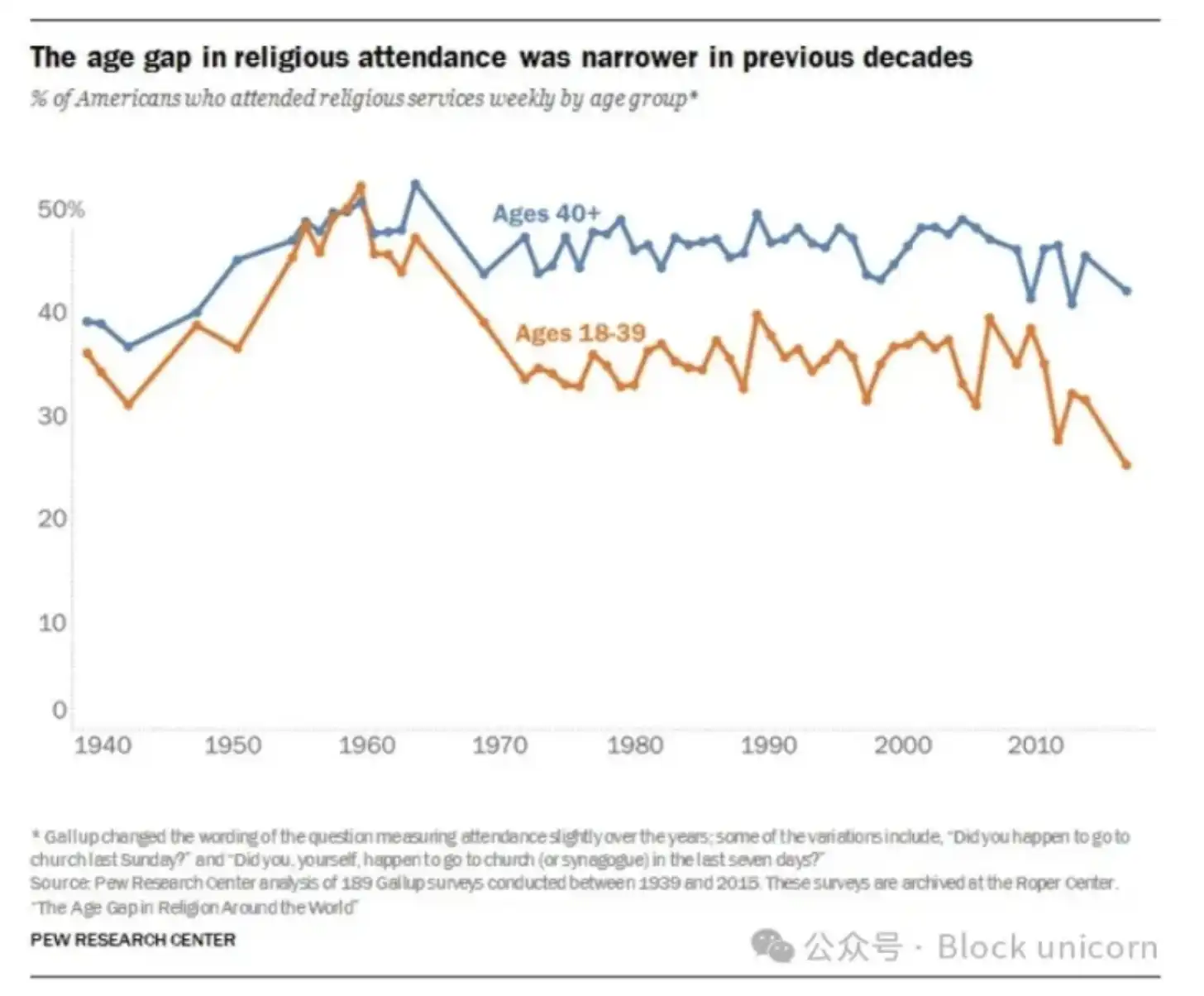 我不太确定莱昂斯对历史的解读是否正确。毕竟,正如罗伯特·普特南在其书《上升期》中记录的那样,美国战后几十年见证了自共和国早期以来教会参与、公民参与、家庭形成和社会团结的最大激增。以下是教会出勤率的数据,二战后激增,直到 2010 年代对 40 岁以上的人群仍保持较高水平:
