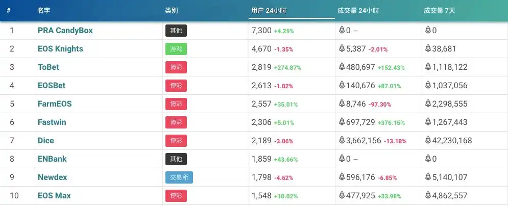 站在今天的视角上看,我们其实很难理解,用户体验这么差的情况下,2018 年底 2019 年初时期的 EOS 却有过一次爆发期:以链上菠菜为主的 dapp 在 EOS 上非常火热。