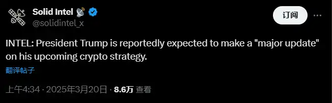 就在 FOMC 会议刚刚结束之际,比特币又迎来利好:特朗普将在明天的 DAS 演讲中发布其加密货币策略的「重大更新」。这是现任美国总统首次参与加密货币大会,意义非凡。自 2024 年竞选以来,特朗普一直是加密行业的坚定支持者,承诺将美国打造为「加密之都」。上任后,他迅速采取行动:3 月 6 日签署行政令,启动基于没收资产的战略比特币储备计划;3 月 7 日的白宫加密峰会上,他进一步释放积极信号。如今,他的 DAS 演讲被视为政策落地的关键节点。
