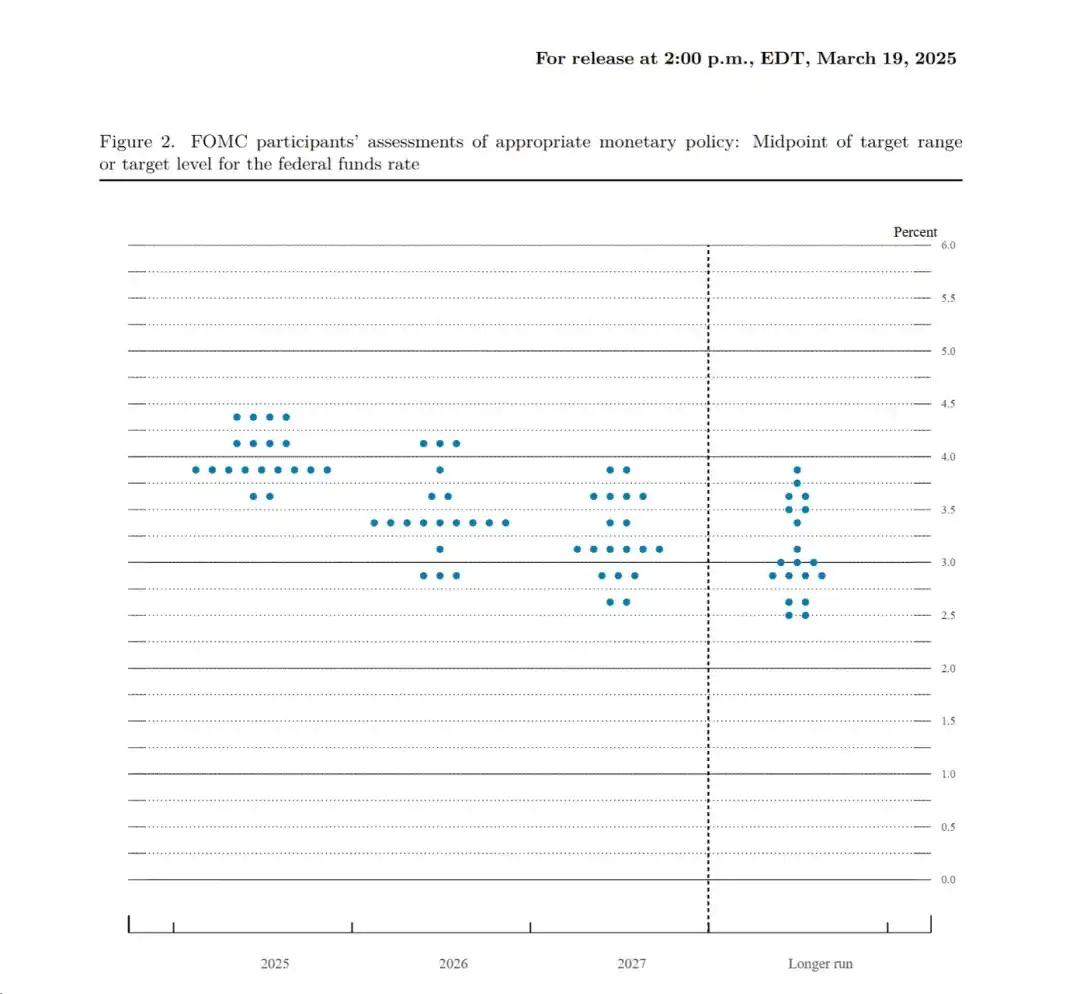 会议发布的经济预测和点阵图(Dot Plot)是投资者关注的另一焦点。点阵图显示,美联储官员对 2025 年和 2026 年各降息两次的预期保持不变,每次降息 25 个基点,总计 100 个基点的降幅,与此前的预测一致。这一结果表明,美联储并未因通胀压力或经济放缓而大幅调整长期政策路径。然而,鲍威尔在讲话中提到,支持更谨慎立场的官员人数有所增加,内部对降息时机的分歧正在扩大。