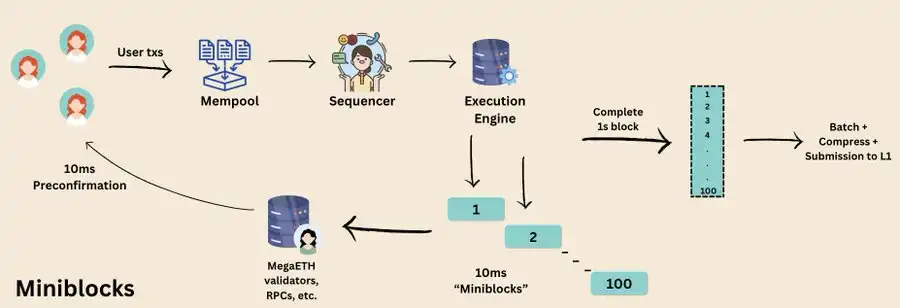 MegaETH 计划将区块时间设定为 1 秒。不过,他们将采用类似 Flashblocks 的预确认策略来优化用户体验。ME 排序器在构建区块的过程中会不断提供交易确认(无特定顺序)。ME 计划每 10 毫秒发布一次预确认,以「Miniblocks」的形式进行。与 Flashblocks 类似,Miniblocks 在不增加超出 1 秒区块的信任假设的情况下,大幅提升用户体验。