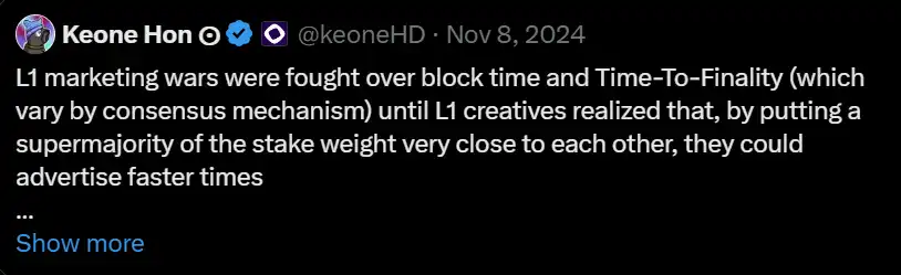 随着区块链性能的提升,sub-second(亚秒级)的预确认将成为常态。获胜的链还将确保对 P(腐败)的惩罚力度非常大,起到强烈的反激励作用。