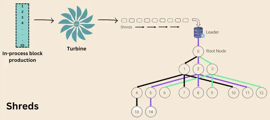 其他验证者在收到 Shred 后即可开始复制交易,并在验证 Shred 后立即发送交易确认(低于 400 毫秒)。