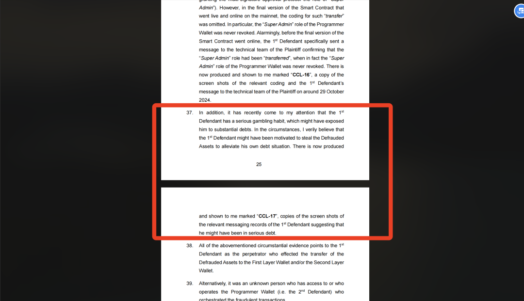 在其中一份宣誓书的正文中,原告表示:最近我才得知第一被告有严重赌博习惯,可能因此背负了巨额债务。我相信这促使他偷窃涉案资产,用于缓解自己的债务。原告还提交了相关消息记录截图,以证明第一被告「可能身陷巨额债务」。(原告指被告后续走火入魔,日常 100 倍杠杆开合约)