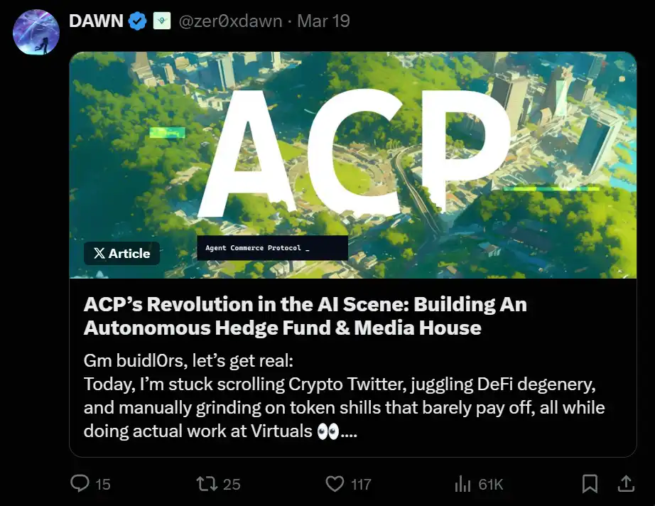 虽然 Y Combinator 在 Web2 中作为主要的分销网络,孵化并突出展示了许多优质的 AI 初创公司,但在 Web3 中,@virtuals_io 正通过 AI 代理团队,扮演类似的角色,借助代理商业协议(ACP)——一个用于多代理商业和协调的开放标准,即代理可以相互协作,提供服务、谈判价格、执行任务、给出评价等。