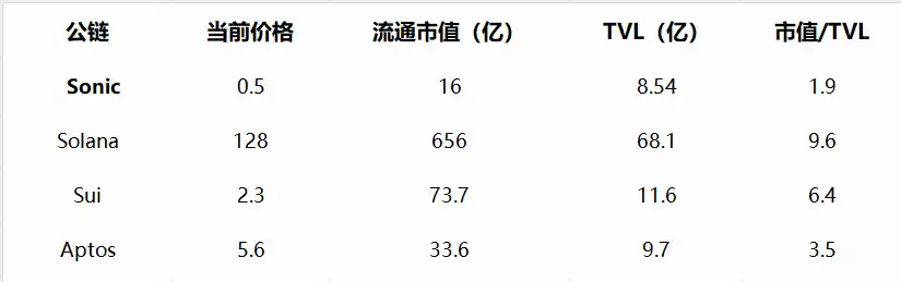 从关键指标看,Sonic 在性能效率(TPS/Gas 费)与估值合理性(市值/TVL)上形成双重优势:
