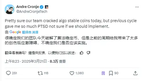 「我们破解了算法稳定币难题,但历史创伤让我犹豫。」 Sonic 联合创始人 Andre Cronje(AC)在 3 月 21 日的推文中抛出震撼言论。其团队声称通过动态抵押率调整算法与多级清算保护机制,解决了 UST 等前辈项目的致命缺陷。尽管技术突破显著,AC 仍坦言「LUNA 崩盘带来的 PTSD 尚未消退」。