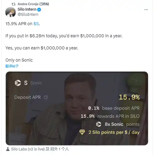 Sonic 联合创始人 Andre Cronje(AC)也转发推文,当前 Sonic 代币 S 的 APY 为 15.9%,如果您今天投入 628 万美元,一年后您将赚得 100 万美元。这远高于其他 Layer1 代币质押的收益。
