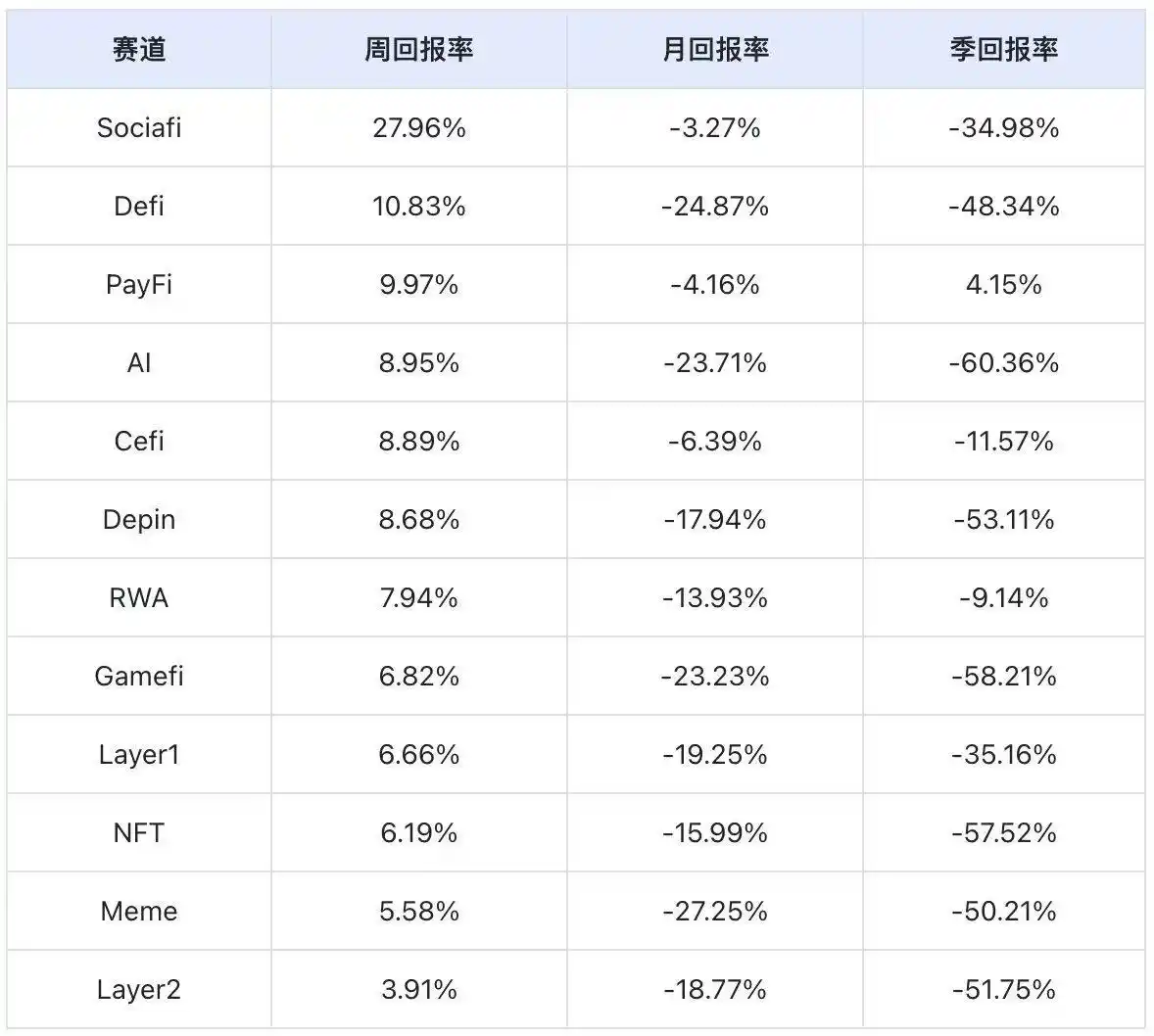 按周回报率统计,Sociafi 赛道表现最佳,而 Layer2 赛道表现最差。
