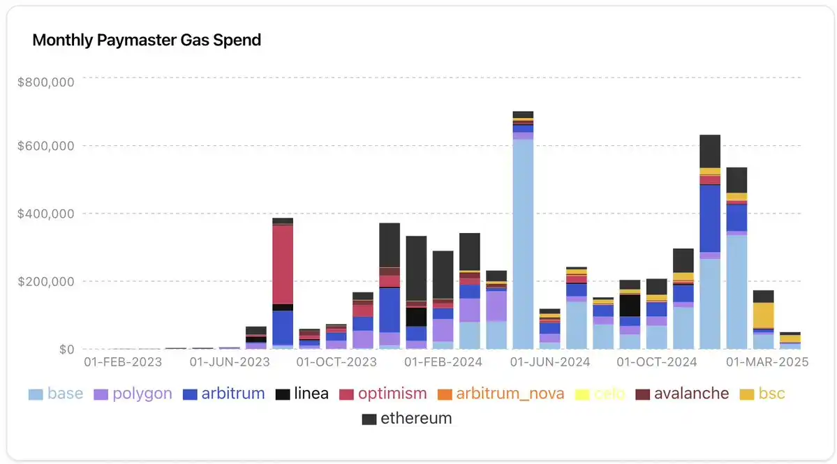 从月度 Paymaster Gas 支出图表中,我们可以看到以下演变: