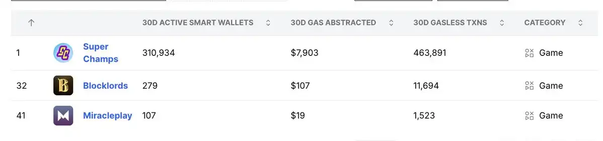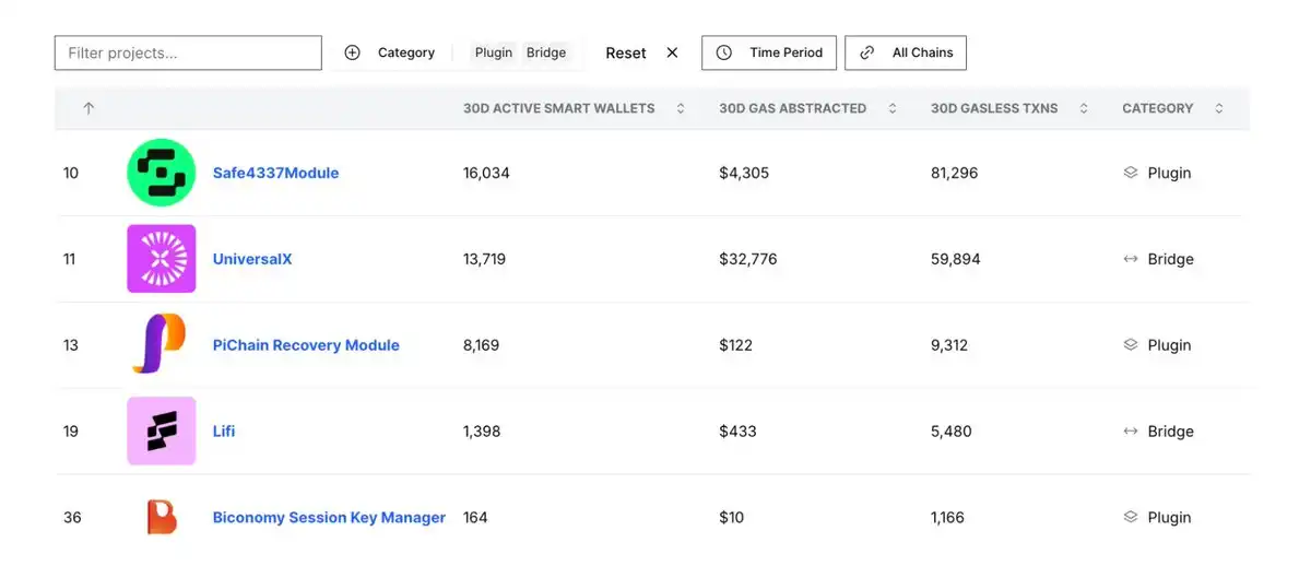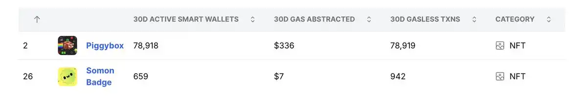账户抽象和 Gas 赞助确实可以提升交易量和用户注册量,但真正的考验是重复参与。结合钱包数量、免除的 Gas 费用和无 Gas 交易量,数据突显了每个类别中集中使用的现象,通常仅来自一两个明星 dApp 或大规模单次领取活动。像 Piggybox 这样的项目展示了钱包与交易接近 1:1 的比例如何将 NFT 项目推上排行榜前列,但在过滤掉一次性账户后可能会迅速跌落。与此同时,桥接和插件解决方案显示出更稳定的中等交易量,反映了生态系统的真实需求,而非短暂的炒作。