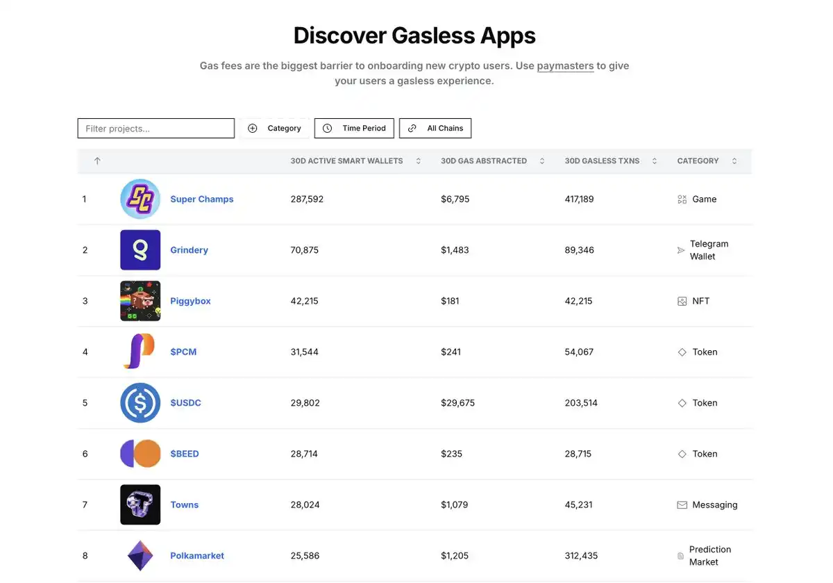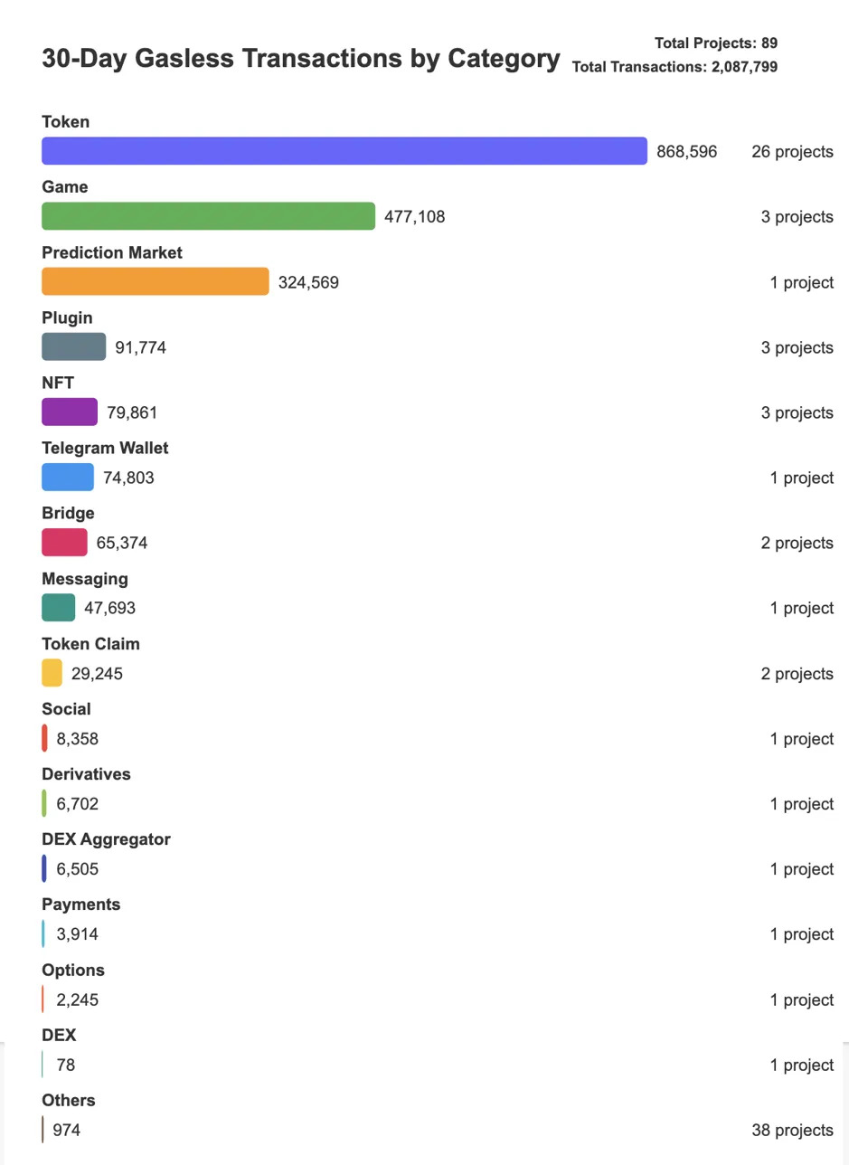 在短短 30 天内,9 条区块链上的 89 个项目支持了超过 200 万笔无 Gas 交易,节省了高达 11.7 万美元的 Gas 费用。