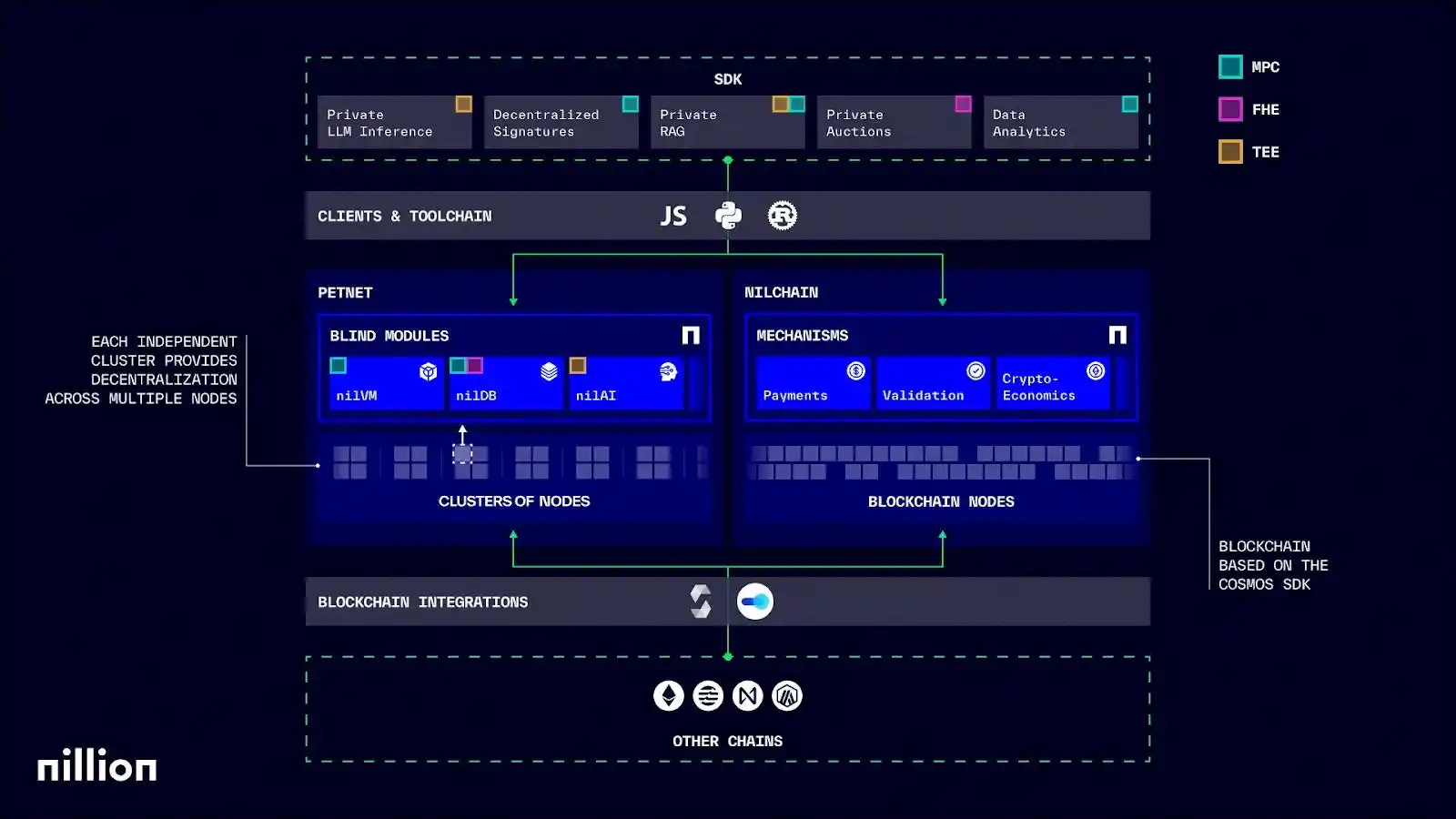 NilChain 基于 Cosmos SDK 构建,主要负责节点管理、任务调度、集群间协调和支付结算等工作,与此同时 NilChain 支持 IBC(跨链通信协议)以实现与其他区块链的互操作性。比如说,nilChain 记录节点的质押和信誉,分配计算任务到合适的 Petnet 节点集群,并处理用户付费与节点奖励。