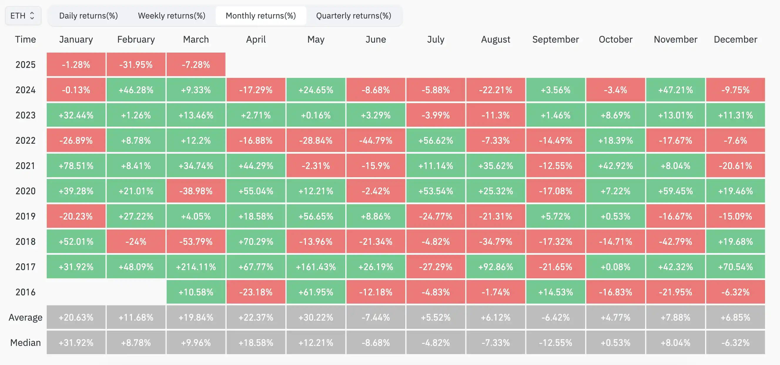 同时,以太坊在今年 Q1 创历史最差表现。Coinglass 数据显示,以太坊在 2025 年第一季度经历了近年来最为惨淡的开局,首次连续三个月均呈现负收益:1 月:-1.28%(历史平均收益:+20.63%,中位数:+31.92%);2 月:-31.95%(历史平均收益:+11.68%,中位数:+8.78%);3 月:-7.28%(历史平均收益:+19.55%,中位数:+9.96%)。