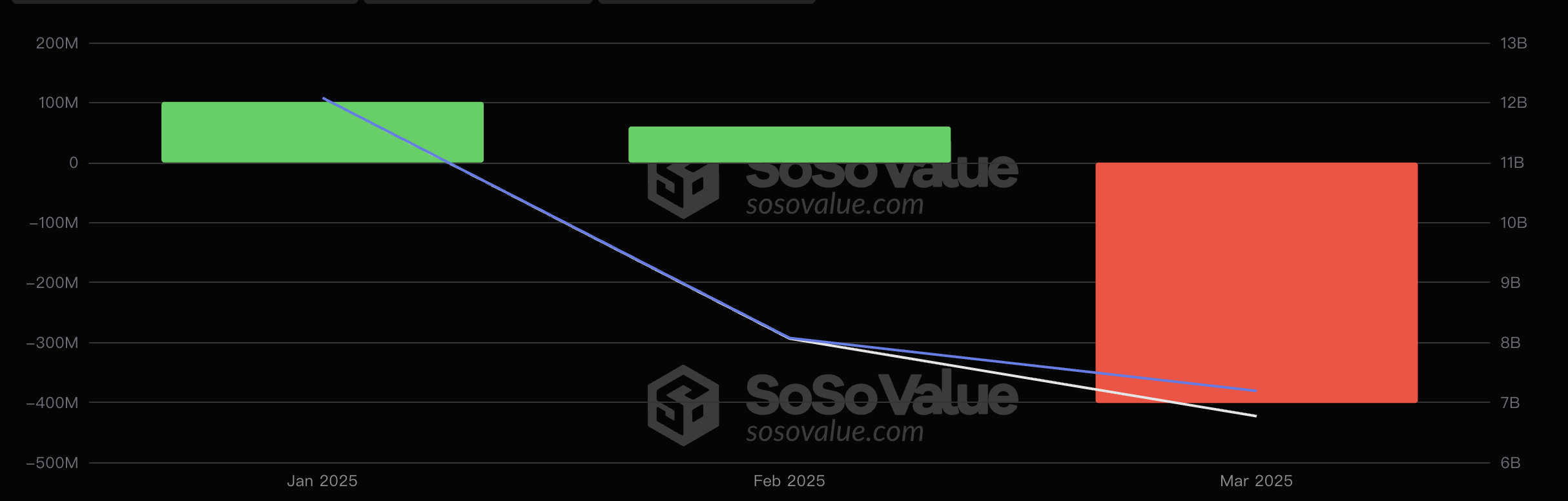 当前,以太坊现货 ETF 资金持续失血,进一步打击了市场信心。据 SoSoValue 数据显示,进入今年以来,美国以太坊现货 ETF 在 1 月和 2 月累计净流入约 1.6 亿美元,但在 3 月已净流出超 4 亿美元,本年度净流出近 2.4 亿美元。相比之下,比特币现货 ETF 虽然在近两个月也在大幅流出,但今年整体净流入量仍超 7.9 亿美元,且本月的净流出规模相较于 2 月缩减了 74.9%。