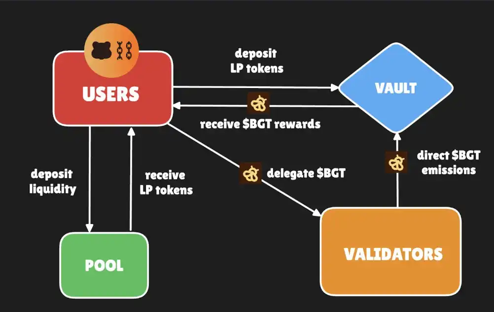 用户向白名单 DeFi 协议(如 DEX 或借贷市场)注入资产后,可通过奖励金库获取$BGT。这些智能合约控制的资金池会持续释放$BGT,激励用户增强生态流动性。