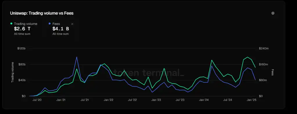 Uniswap 的交易量和 Fee,来源:tokenterminal
