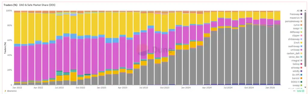Uniswap 在过去一年仍然占据 EVM 生态的 DEX 市场头部,整体市占率仍然维持首位,但市场份额的整体趋势持续下滑。下图是 EVM 生态(包含所有的 EVM L1、L2)所有 DEX 的市场份额走势。