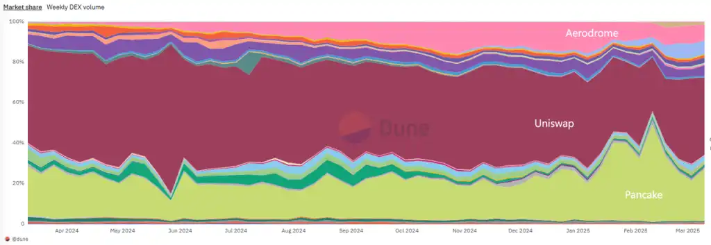 第二名是 Pancakeswap,第三名则是 Aerodrome,分别是 Bnbchain 和 Base 的头部 DEX(尽管 Uniswap 在这两条链也进行了部署)。