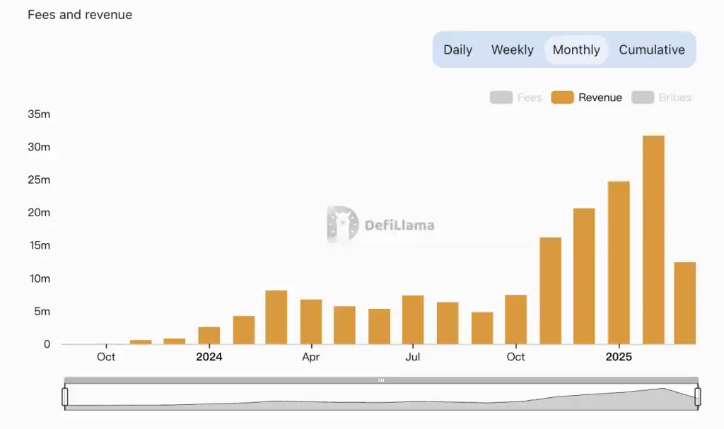 Moonshot 的交易量(左轴)和手续费(右轴)来源:Dune