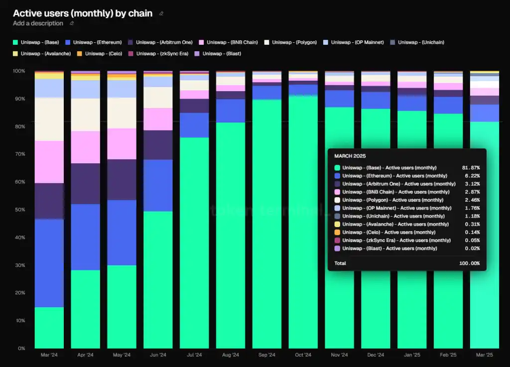其中,Base 是活跃用户的主力军,占到 Uniswap 在所有链活跃用户数的 82%。