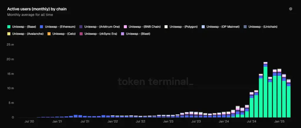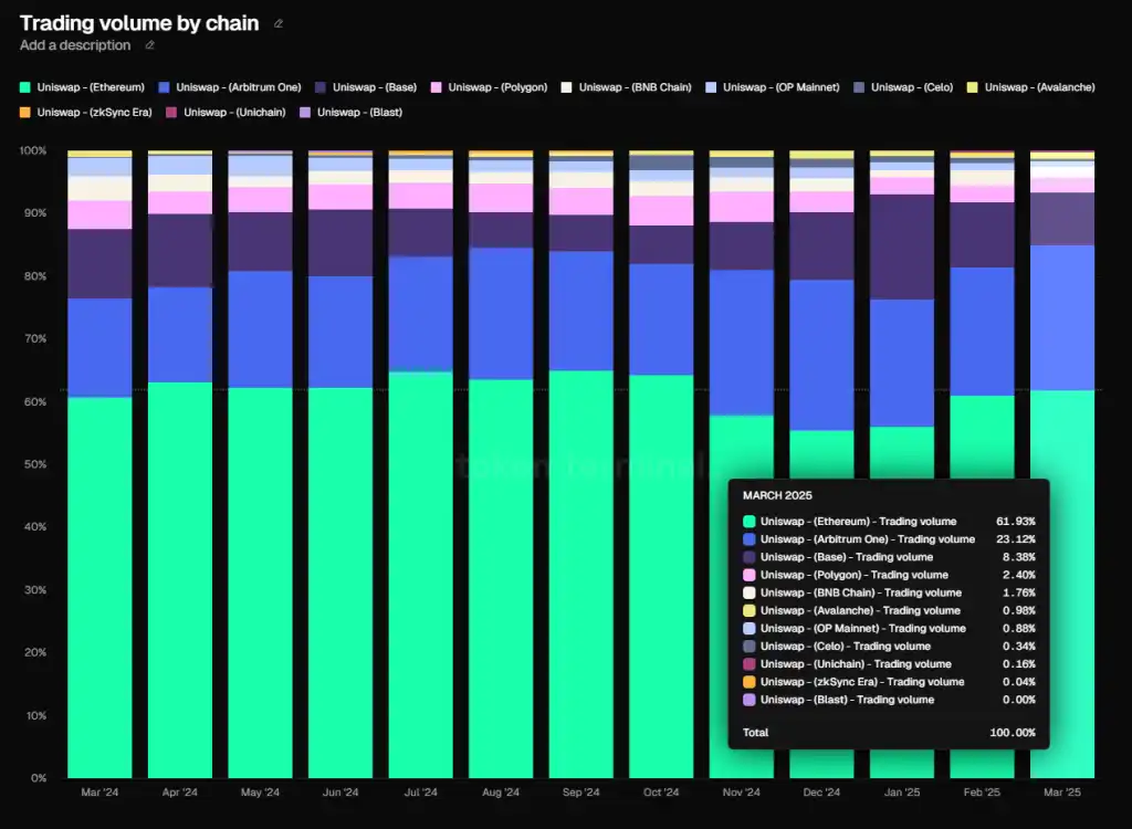 Uniswap 的月活跃地址数的多链分布,来源:tokenterminal