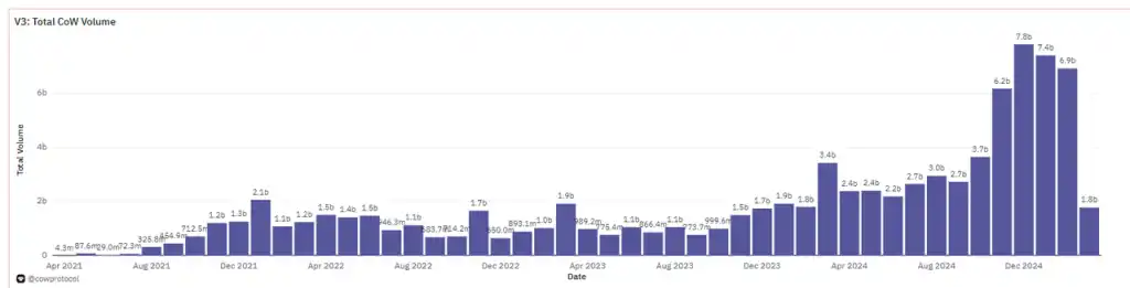 作为新兴的意向撮合协议,CoW Swap 在过去三年经历了快速发展。2021 年协议尚处于起步阶段,早期交易量较小。进入 2022-2023 年,Cow Protocol 随着 DeFi 领域对 MEV 防护和高效聚合交易的需求增长,业务数据开始提升。在 2024 年,协议交易量进一步大幅攀升:月度交易量在 2024 年底创下新高,2024 年 12 月单月成交额接近 78 亿美元,2025 年 2 月仍有近 69 亿美元,远高于往年水平。
