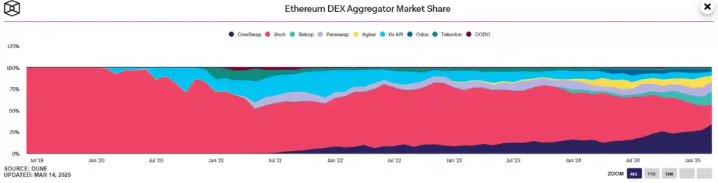 Cow Protocol 的主要战场是去中心化交易聚合器领域。该领域早期由 1inch 一家独大,然而近两年格局开始多元化。根据 2025 年 3 月 The Block 的最新数据(未包含 UniswapX),1inch 的市场份额已经跌落榜首(3 月 5 日,1inch 的 Fusion 功能遭遇攻击,损失超过 500 万美金,加剧了用户对其安全的担忧),仅以 22.8% 屈居第二位,而 Cowswap 以 33.85% 反超,首次月度数据位居第一。