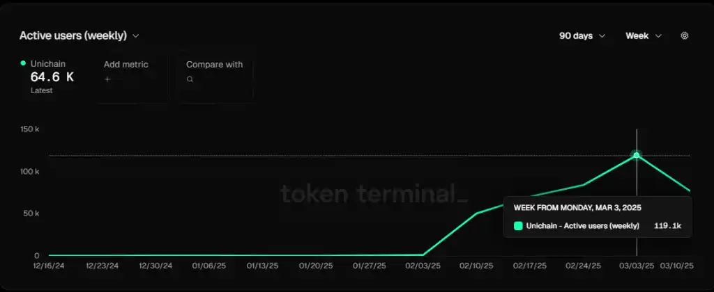 Unichain 自从今年 2 月初正式上线以来增加较快,三月初的周活跃地址数已经达到了近 12 万个,该数据在所有 L2 中排名第 7,高于 zksync、Manta、Scroll 等知名 L2 项目。