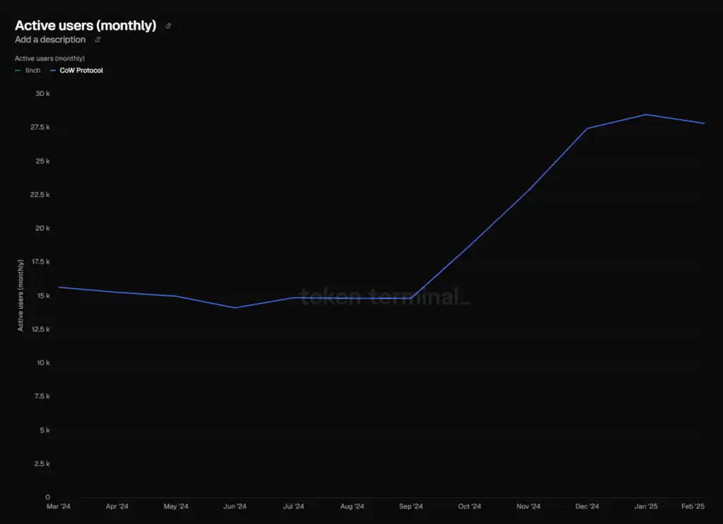 Cow Protocol 过去一年的月活跃用户,数据来源:Tokenterminal