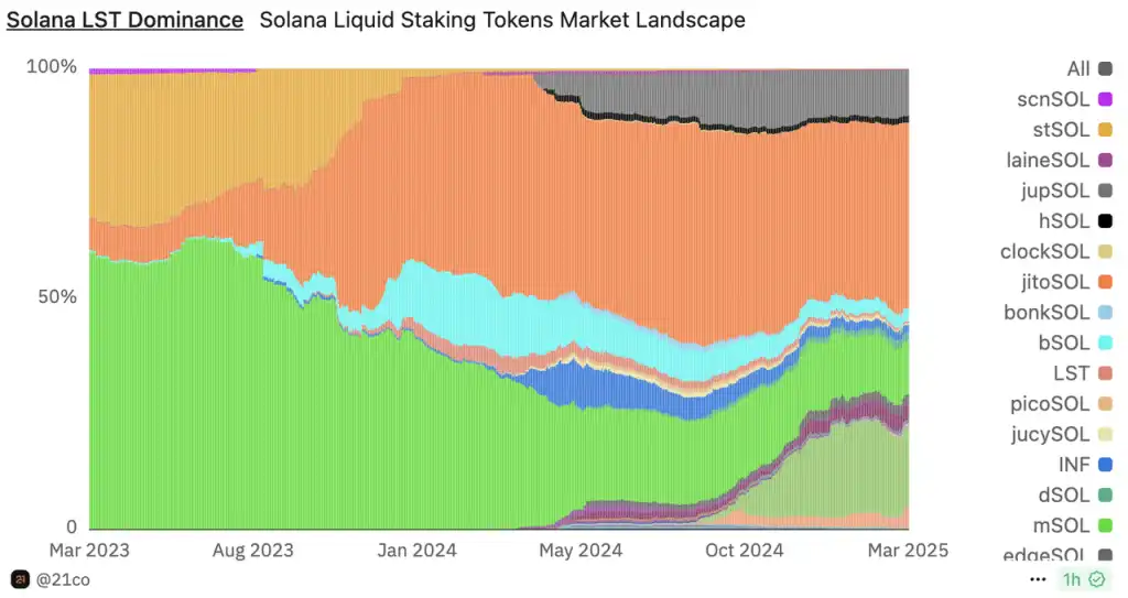 Solana LST 市场份额占比(上方灰色块为 jupSOL)来源 Dune