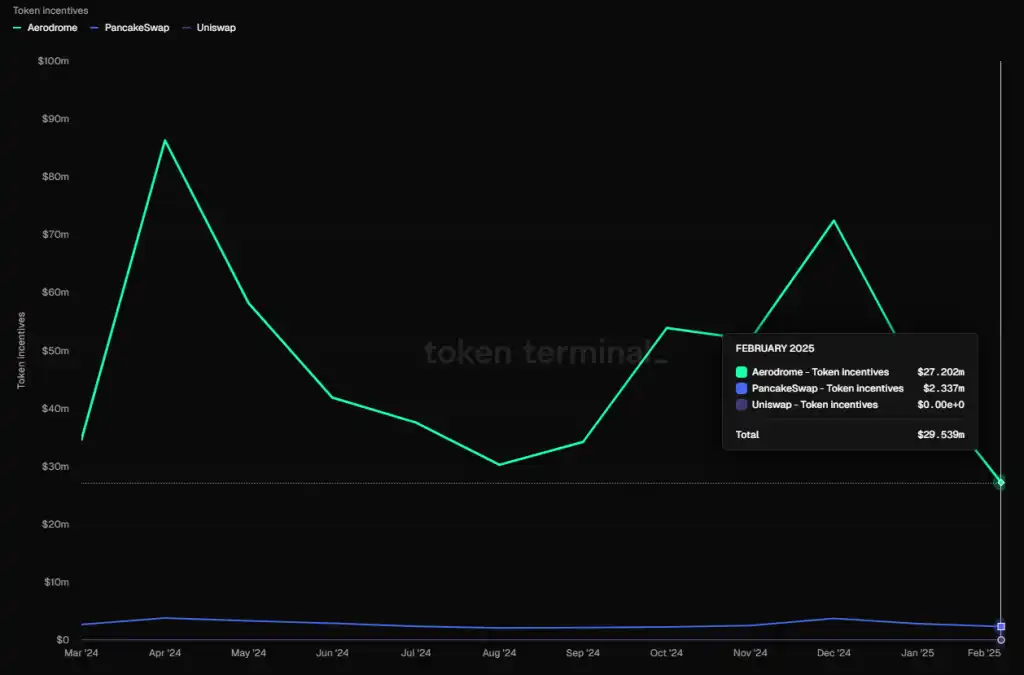 Uniswap 没有进行任何代币补贴,而 Pancake 和 Aerodrome 仍在进行较高规模的代币补贴,尤其是 Aerodrome,其 2 月的代币激励价值高达 2700 万美金(见下图)