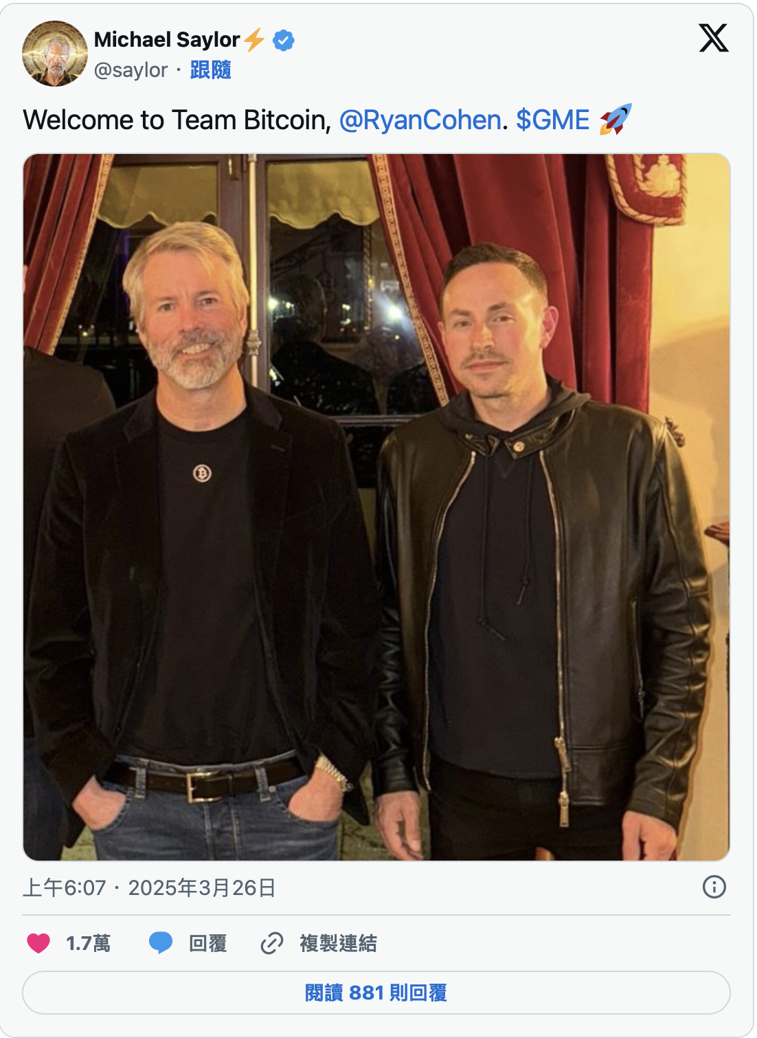 其实,这一决策早有迹象:两个月前,GameStop CEO Ryan Cohen 与 BTC 头号支持者 Michael Saylor 会面的照片流出后,其大股东 Strive 资产管理公司便公开呼吁公司效仿 MicroStrategy 的持币策略。Strive CEO Matt Cole 当时表示:「我们相信 GameStop 可以通过购买比特币改善财务状况,这是一种战略配置。」