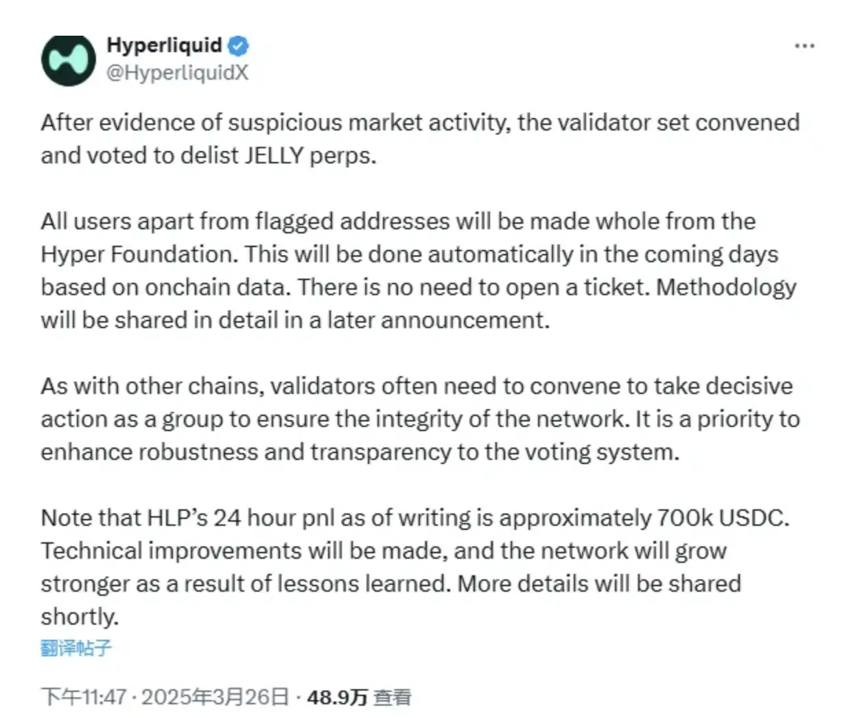 针对「Hyperliquid 下架 JELLY 并以 0.0095 美元的有利价格完成结算」如此「中心化」的操作,官方也在第一时间对该事件进行正面回应,具体内容如下: