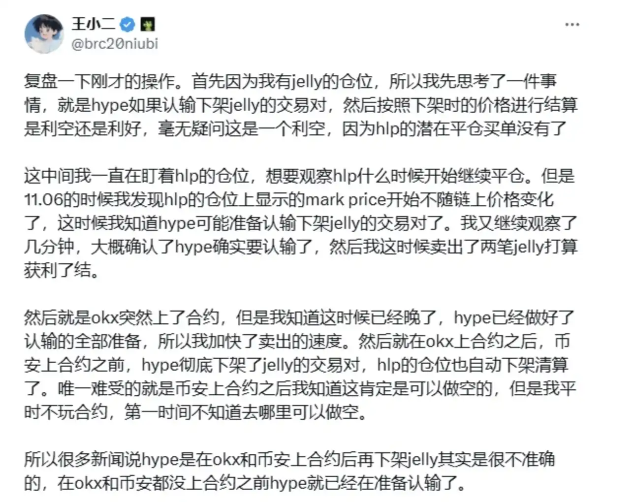 根据 KOL 王小二(@brc20niubi)在 X 平台描述(CZ 也评论了该内容),在 OKX、币安相继宣布上线 JELLY 合约交易之前的几分钟,Hyperliquid 已经做好了认输的准备并彻底下架了 JELLY 交易。下图为王小二对本次 Hyperliquid 的操作回顾与 CZ 评论。