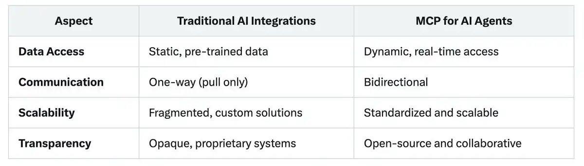 为什么 MCP(及其类似框架)在与传统 AI 集成相比时脱颖而出?传统集成通常涉及定制化 API 或中间件,导致解决方案碎片化,且难以扩展。而 MCP 提供了一个通用标准,降低了复杂性并确保一致性。