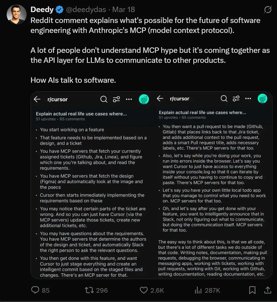 但自从 @anthropicai 推出了这一通信标准后,越来越多的 AI 解决方案开始将其作为默认方式。简单来说,它就是「AI 实时与软件交互的方式」。