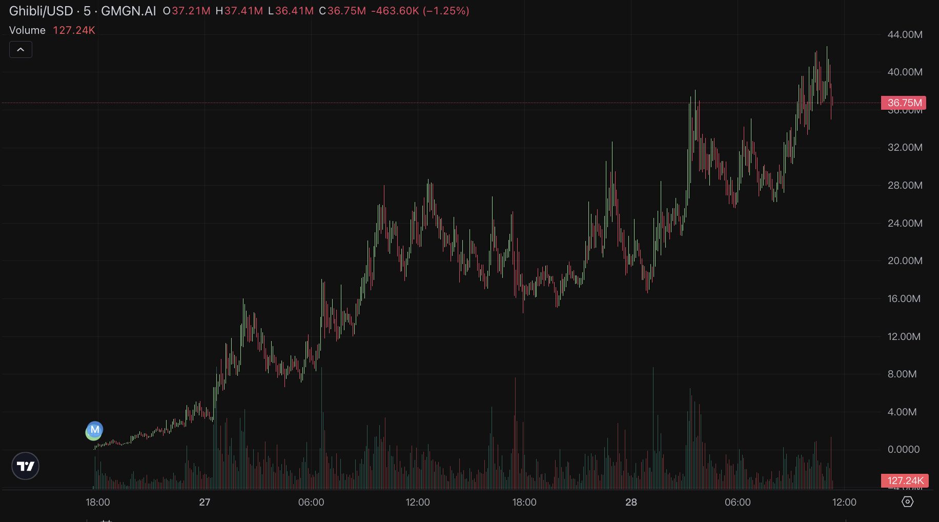 与此同时,Solana 生态 meme 币$Ghibli 突破 40m,创历史新高,成为冷淡行情中为数不多的「金狗」。