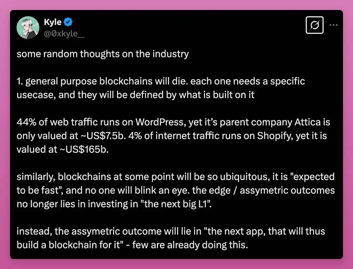 我最担心的是 Fogo、Initia 和其他正在推出的连锁店是否会被采用?它们上面推出了哪些杀手级应用。正如 Kyle 所说:
