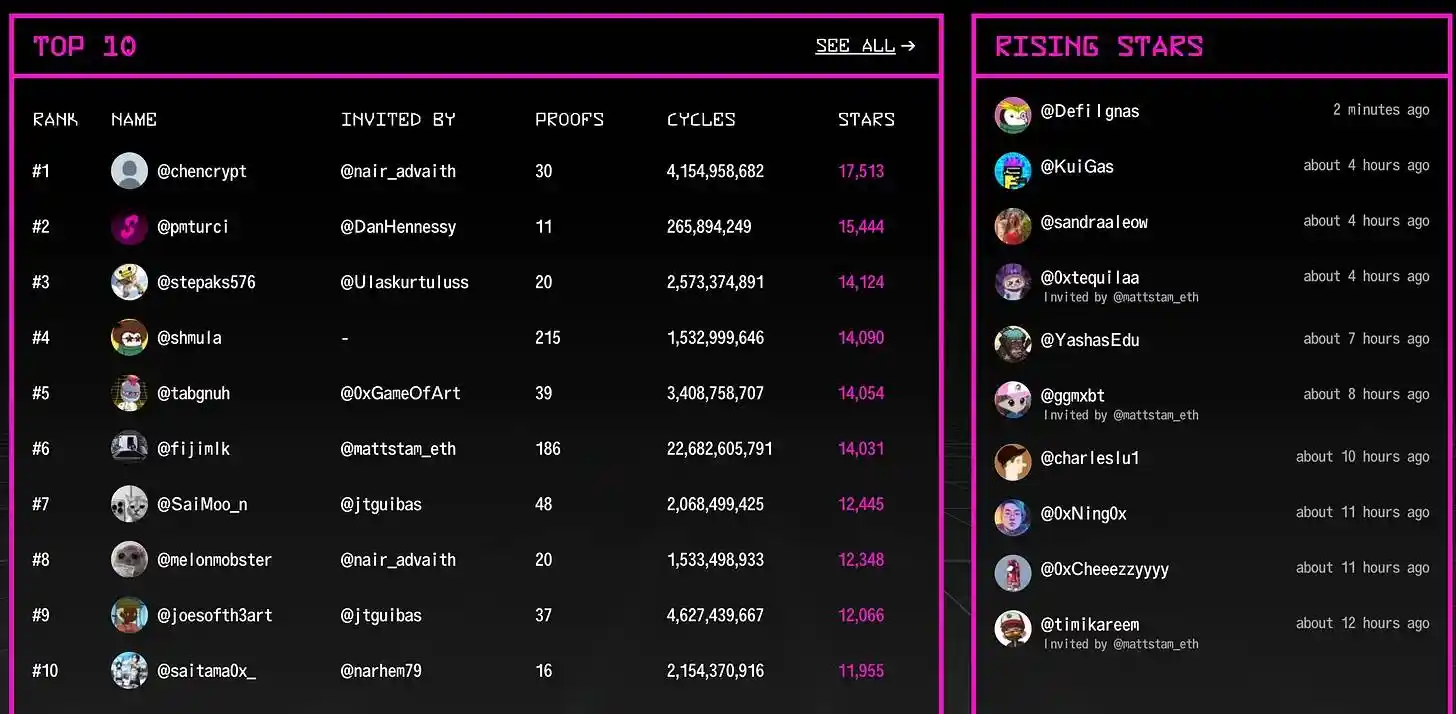 他们的测试网「第一级:信任危机」于两个月前启动。您可以通过生成零知识证明来获得星星。您需要 10 美元的 USDC 存款来支付证明生成成本。但要获得邀请码,您需要在 X、Discord 等平台上耕种它。