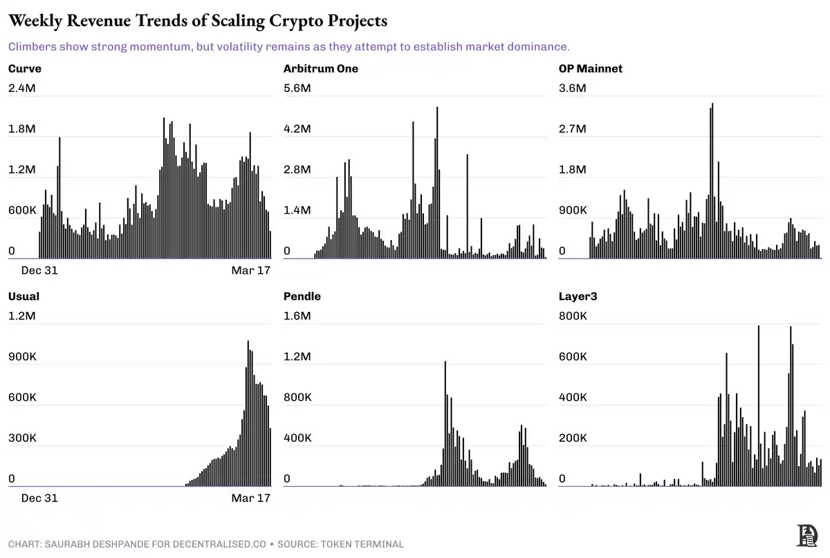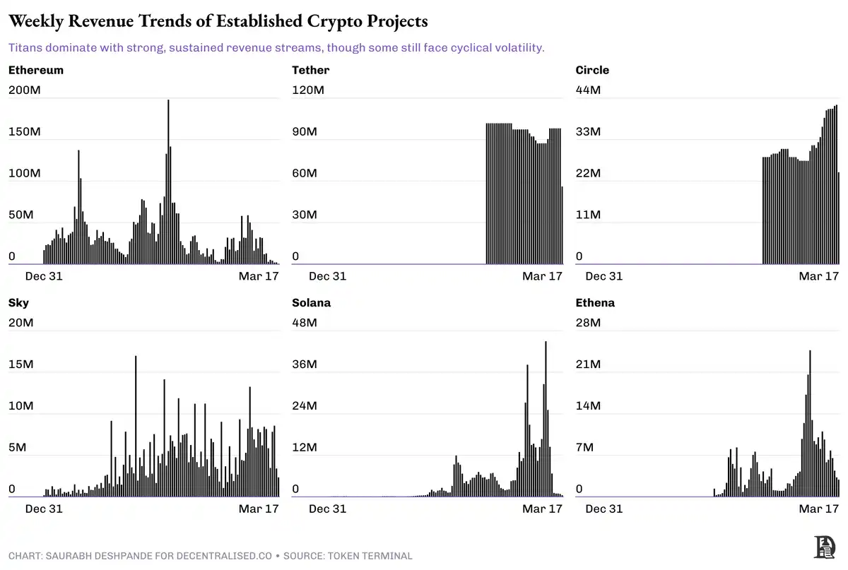 这类项目往往声量最大,但也是最脆弱的。它们的短期收入可能能与巨头们媲美,甚至一度超越,但这些增长通常依赖于市场炒作、投机情绪或短暂的社交趋势。