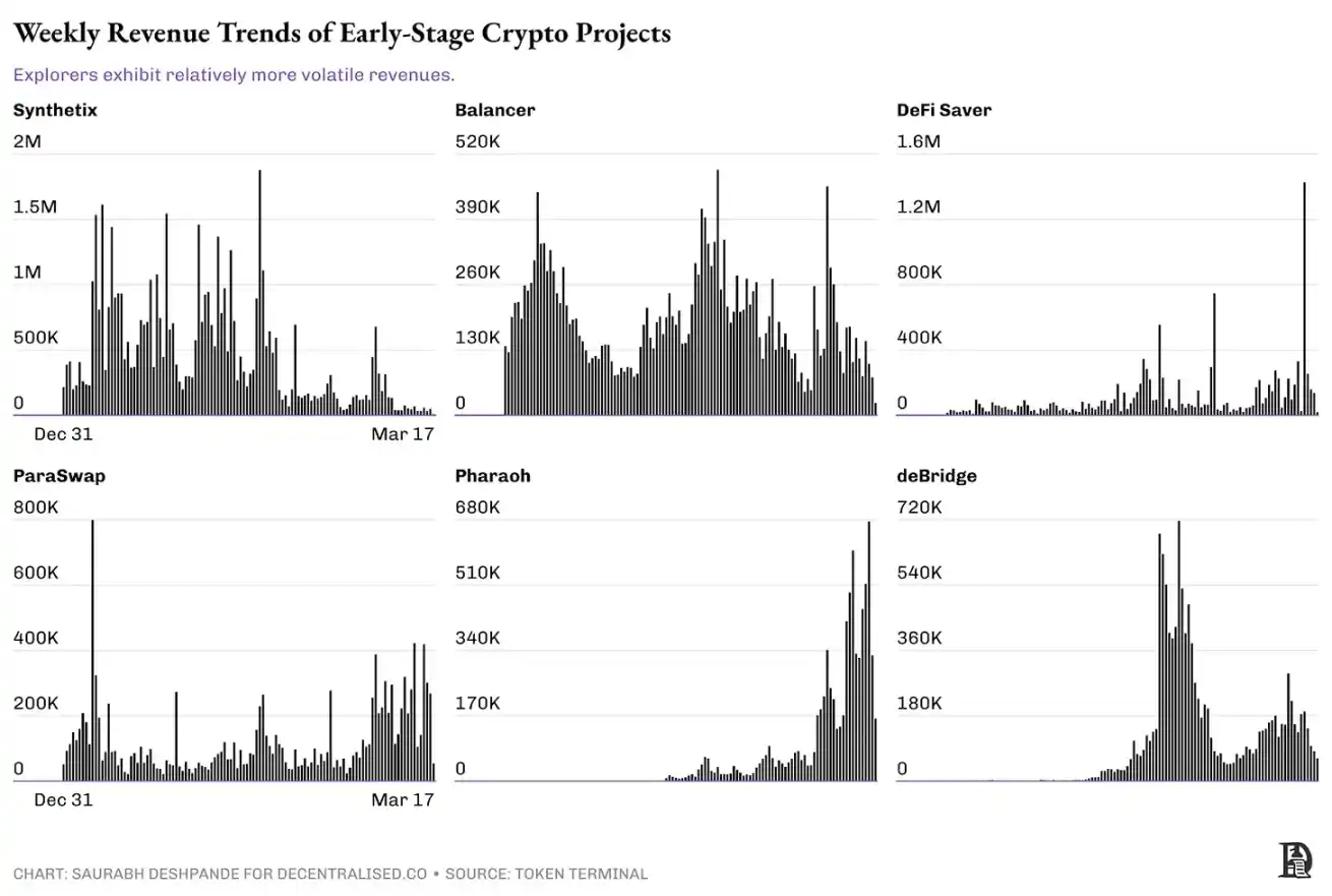 这些项目仍在寻找产品与市场的契合点,营收模式凸显了它们难以维持持续增长的困境。像 Synthetix 和 Balancer 等项目,营收呈现大幅飙升后又显著下滑的态势,这表明它们存在投机活动期,而非稳步被市场接纳。